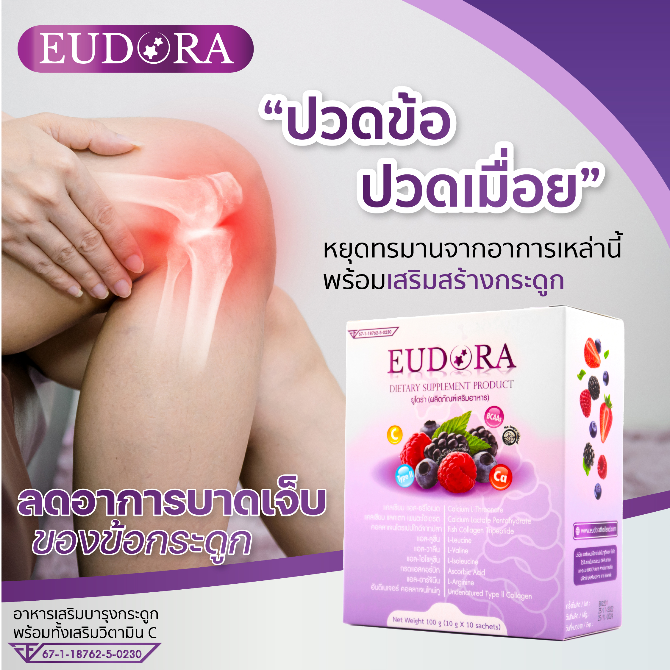 Collagen type 2 Uc2 เป็นคอลลาเจนชนิดเดียวที่พบในกระดูกอ่อนบริเวณข้อต่อ ซึ่งเป็นคอลลาเจนที่ช่วยซ่อมแซมส่วนที่สึกหรอของข้อ ด้วยการกระตุ้นให้เกิดการสังเคราะห์เซลล์ใหม่เพิ่มขึ้น ช่วยเพิ่มระดับกรดไฮยาลูโรนิค ( Hyaluronic Acid ) และยับยั้งการทางานของเอนไซม์ที่ย่อยสลายน้าหล่อเลี้ยงข้อ สามารถช่วยลดอาการปวดข้อและข้อยึด ทาให้ร่างกายเคลื่อนไหวได้ดีขึ้น